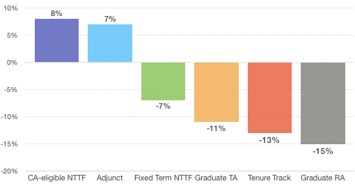 There is also a discernible trend towards dis-investing in the more stable faculty jobs (tenure-track), and increasingly shifting “the work of the university” to less stable, lower pay, faculty jobs. There is also a notable reduction in graduate employees, with the attendant impact on research, graduate programs, and faculty workloads.