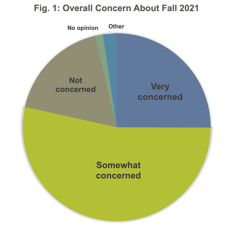 As of Thursday, April 29th, the survey had 511 responses — half of our membership, a very good survey response rate. Approximately 80% of respondents are concerned about their own health when the time comes to return to on-campus work in the fall, with 25% very concerned (Fig 1).