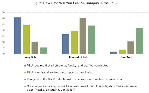 To ascertain what might be the cause of such concern, we asked how safe respondents would feel under different circumstances when it comes to the spread of the coronavirus and the efforts put in place to mitigate it (Fig 2). If PSU requires that all faculty, staff, and students be vaccinated, over 60 percent will feel very safe returning to on-campus work. On the other hand, if PSU does not require vaccinations but instead implements other mitigation measures like requiring masks and social distancing, only 11%will feel very safe and 44%will not feel safe (fourth asparagus green bars in the clusters).